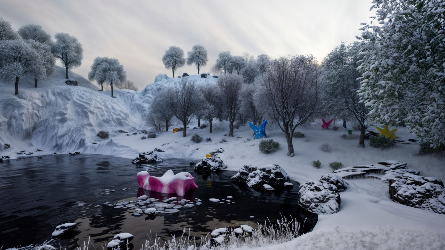 Set in a digitally constructed Eden, Summer Creatures presents an artificial landscape inhabited by vibrant plastic creatures, blending organic and synthetic elements.